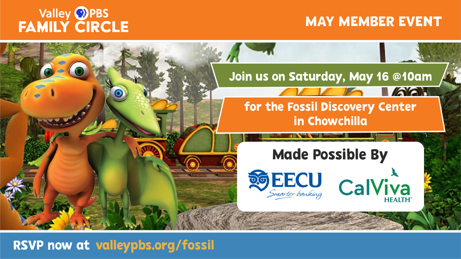 Valley PBS Family Circle is taking the Dinosaur Train over to Fossil Discovery Center on May 16, 2026 at 10am. Let’s explore and discover together the Dino-Rific fossils of the Central Valley.