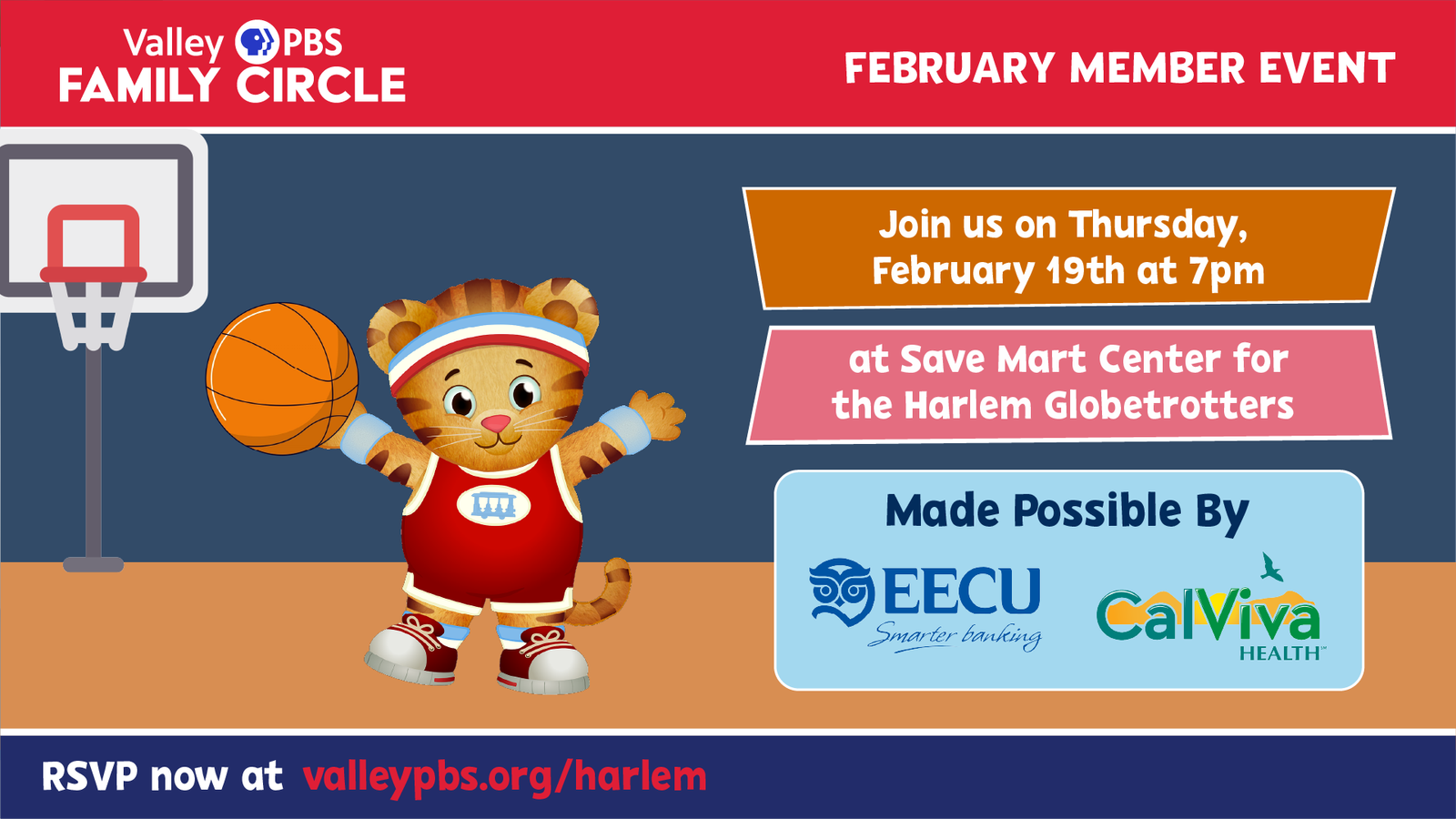 Valley PBS Family Circle will be spinning and slam dunking with The Harlem Globetrotters on Thursday, February 19th at 7pm, Save Mart Center where basketball becomes magic.