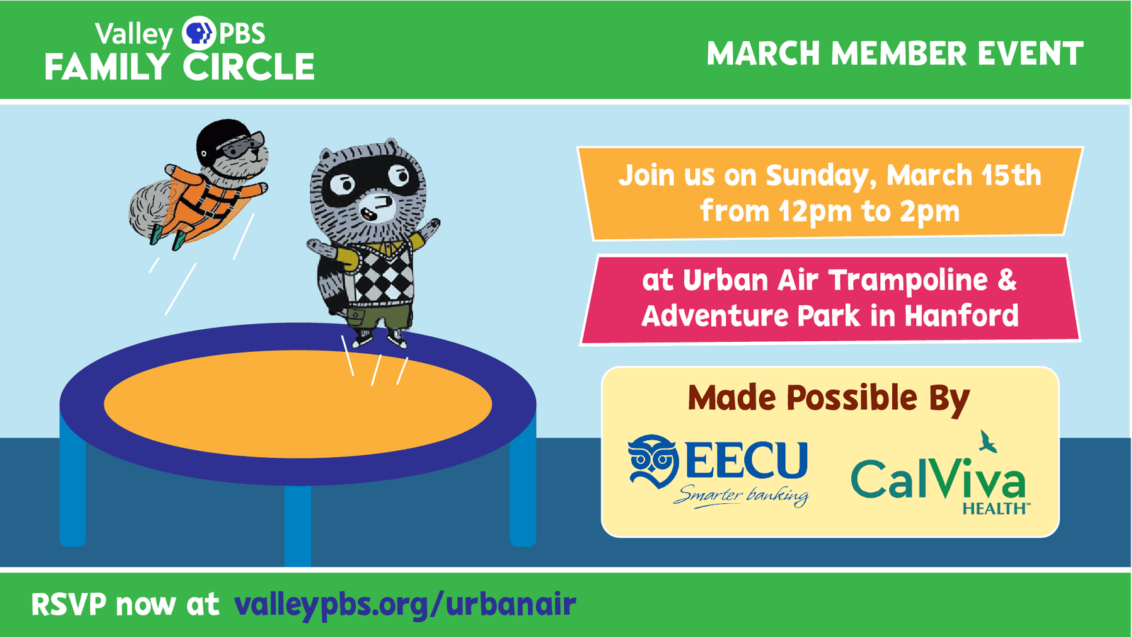 Valley PBS Family Circle will be jumping the day away at Urban Air Trampoline & Adventure Park on Sunday, March 15th from 12pm to 2pm in Hanford. Valley PBS will be purchasing ALL socks for everyone under 18 years old.